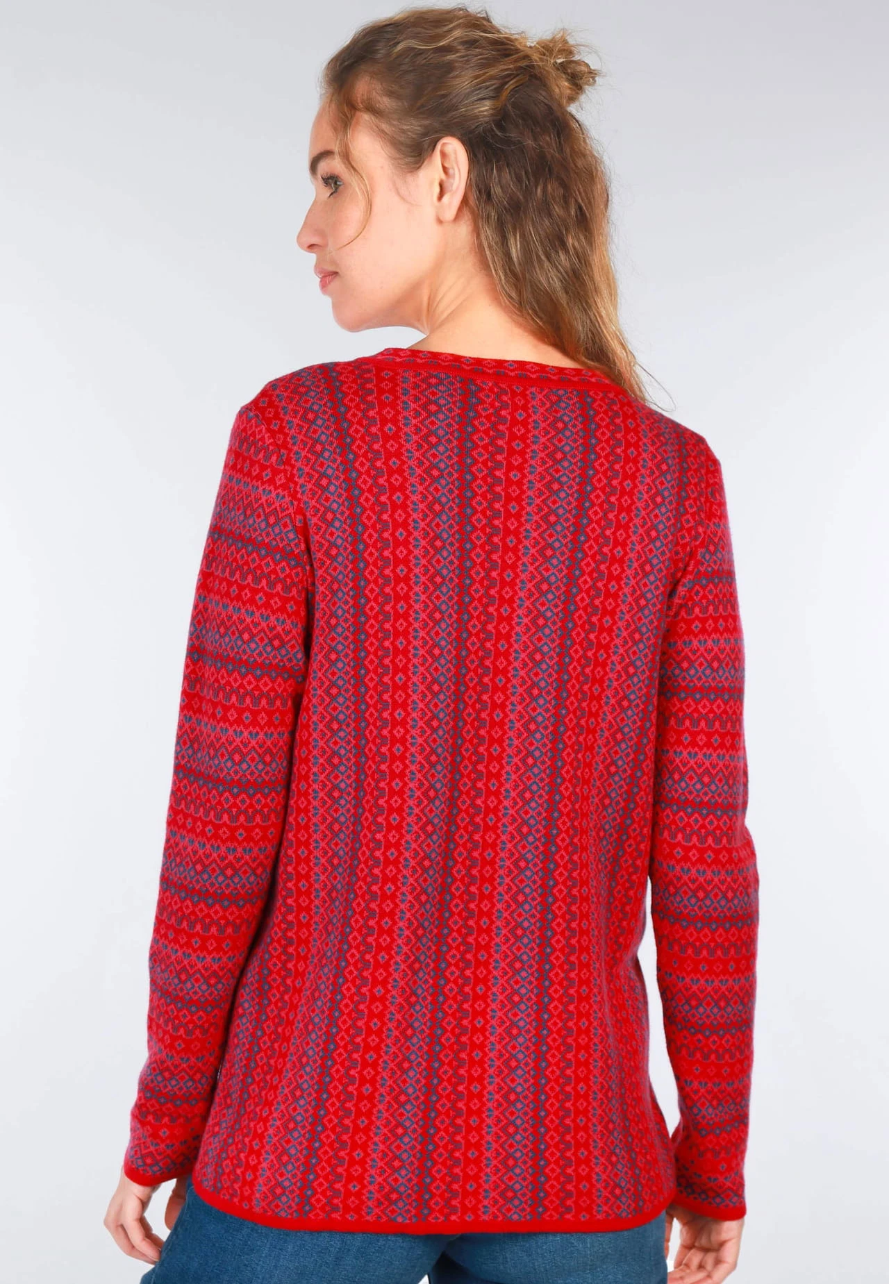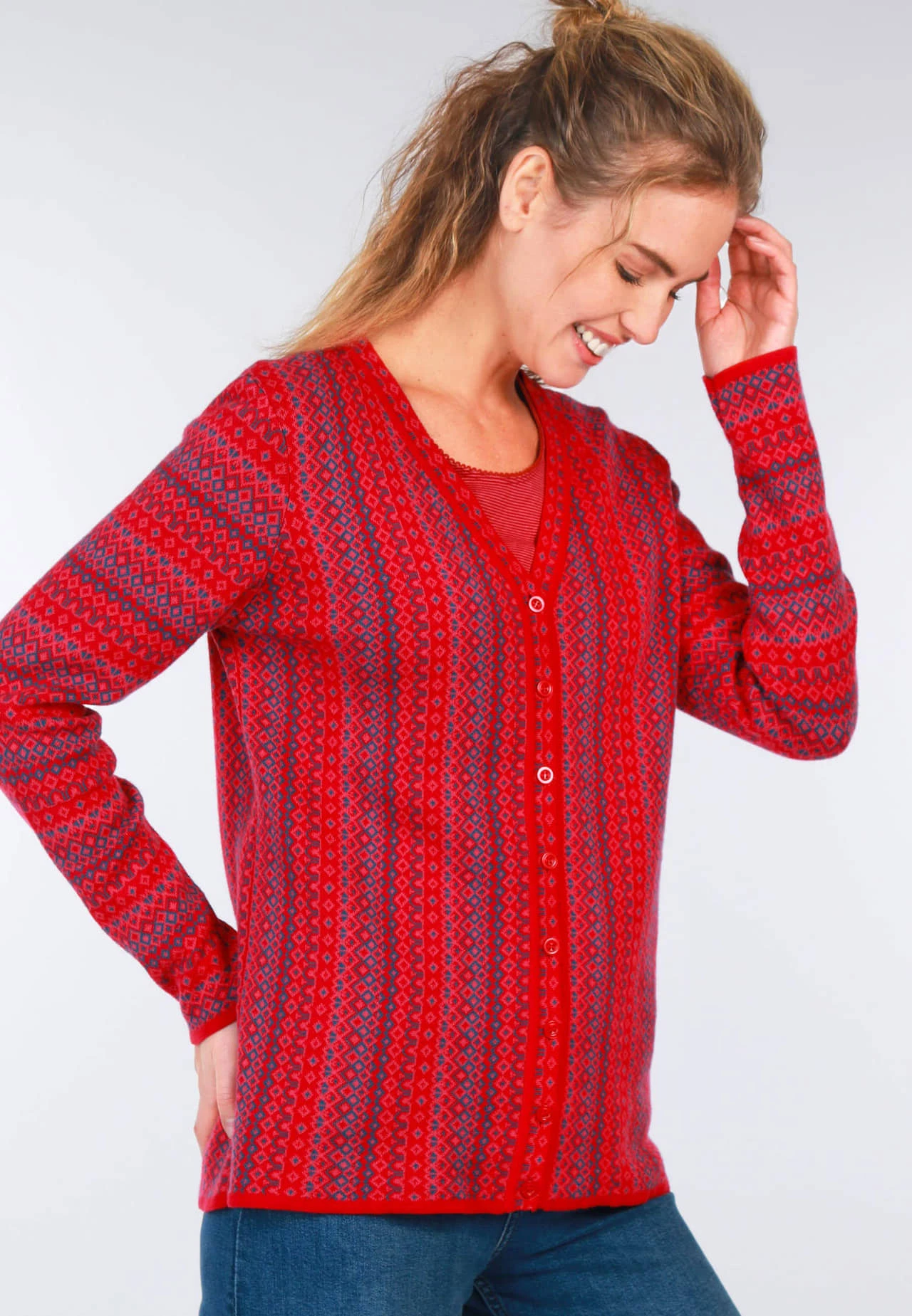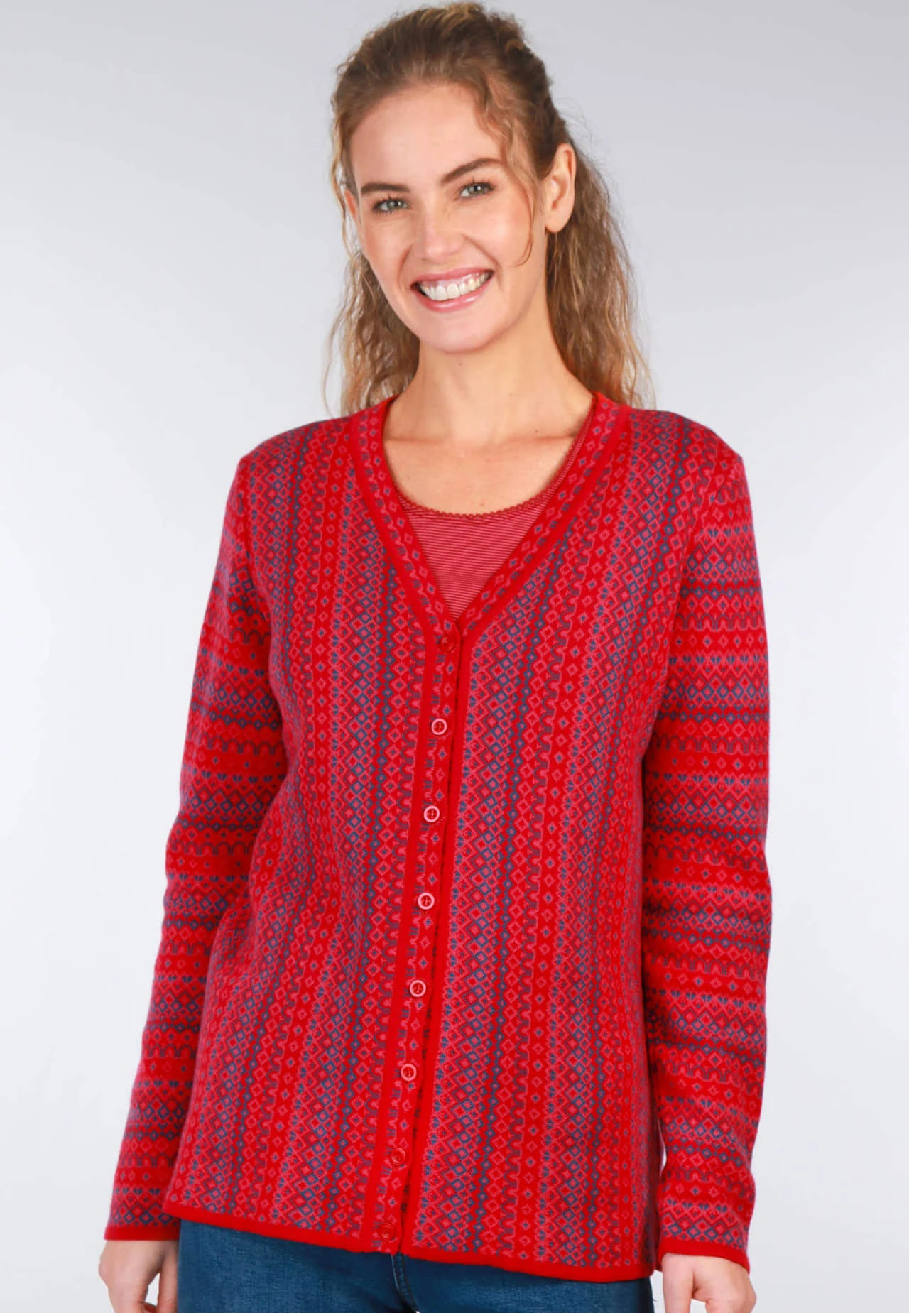 Länge 65cm (M). Unser V-Neck-Cardigan ist ein absolutes Must-Have für jede modebewusste Frau, die auf Nachhaltigkeit setzt. Das farbenfrohe florale Jacquardmuster ist ein Blickfang und sorgt für einen femininen Look. Hergestellt aus 100% Organic Cotton ist sie nicht nur angenehm zu tragen, sondern auch umweltfreundlich produziert. Die lockere Passform und der modische V-Ausschnitt machen diese Strickjacke zum vielseitigen Begleiter für jeden Anlass.