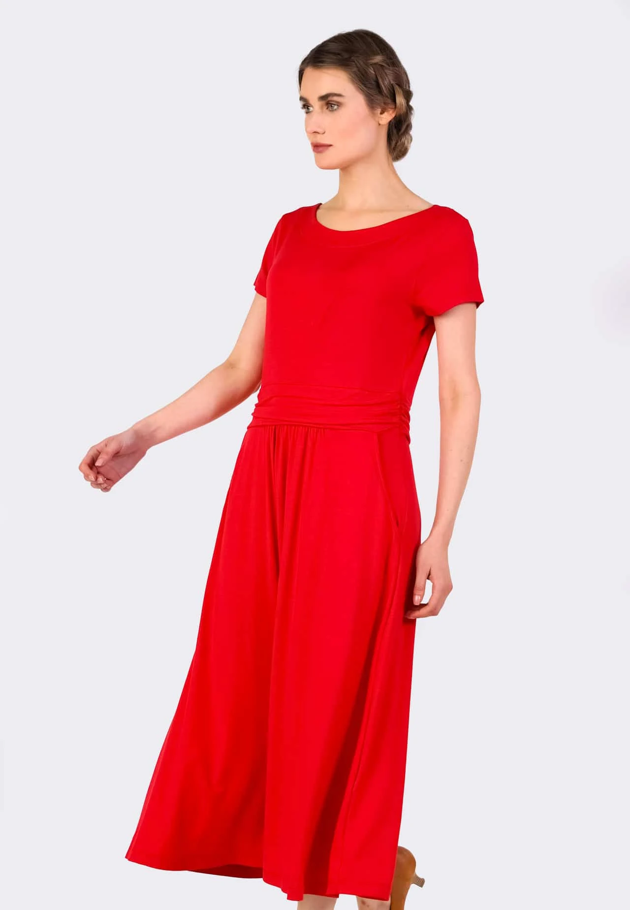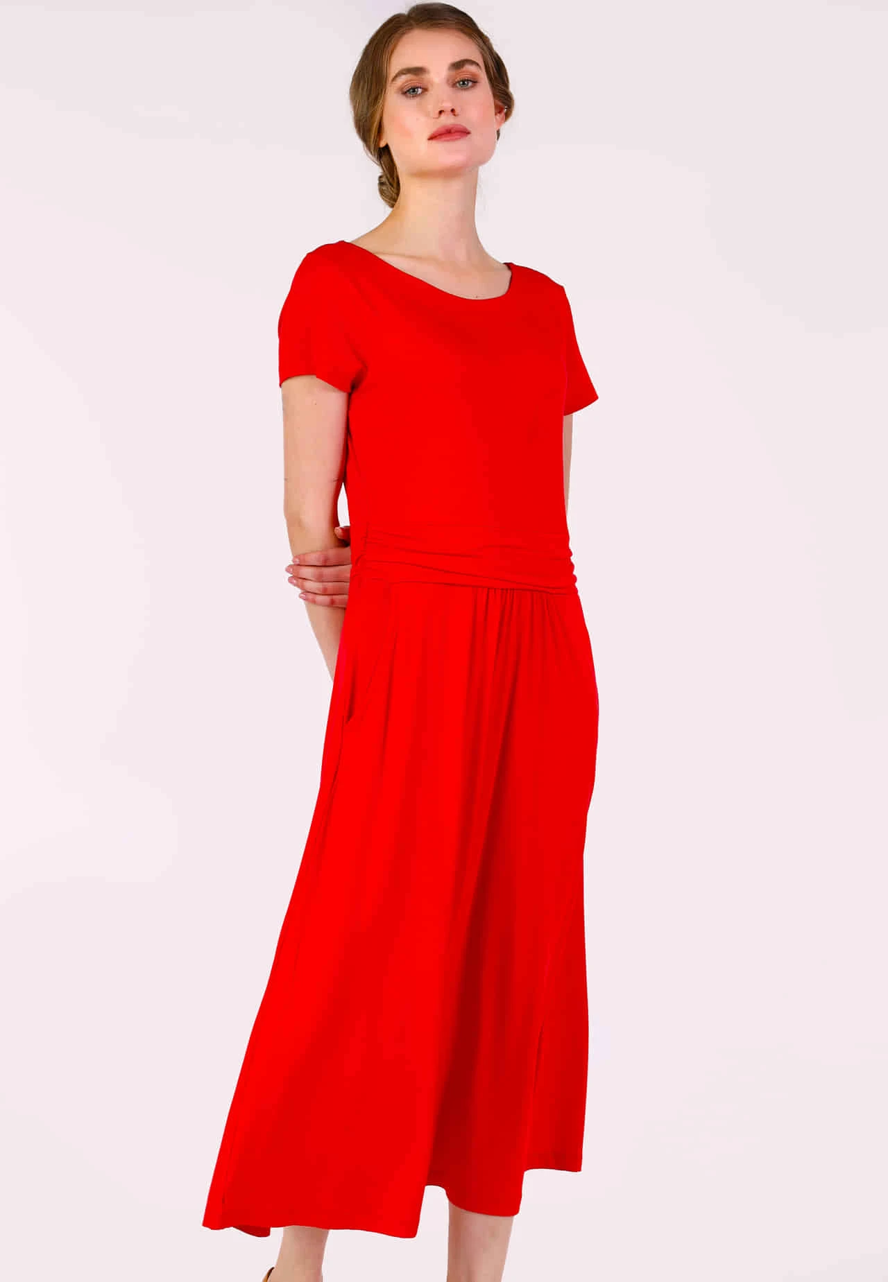 Länge 118cm (M). Unser elegantes Kleid Malinda aus nachhaltiger Viskose in einer modernen Midilänge ist ein traumhafter Blickfang! Der leichte U-Boot Ausschnitt und die lässigen Eingrifftaschen in den Seiten setzen lässige Akzente. Der schwingende Rock mit der charmanten Raffung in der Mitte unterstreicht den femininen Charakter.