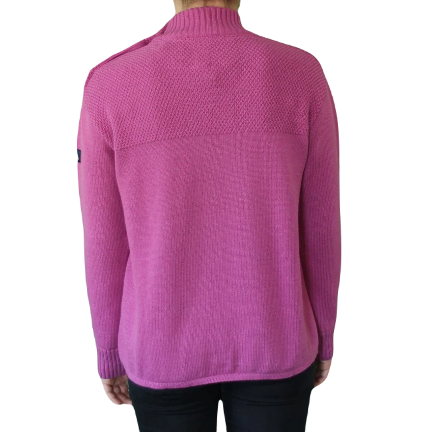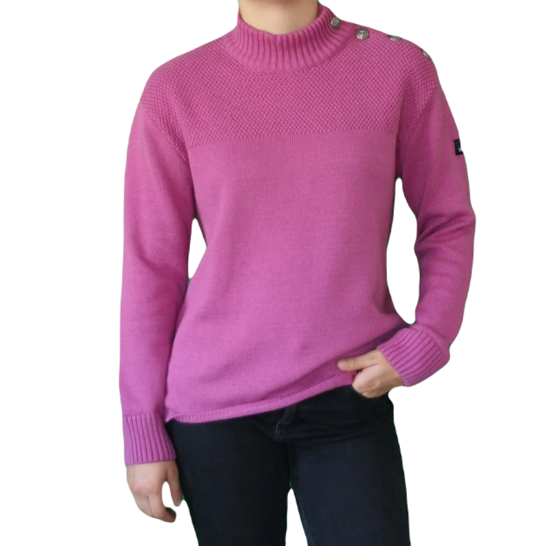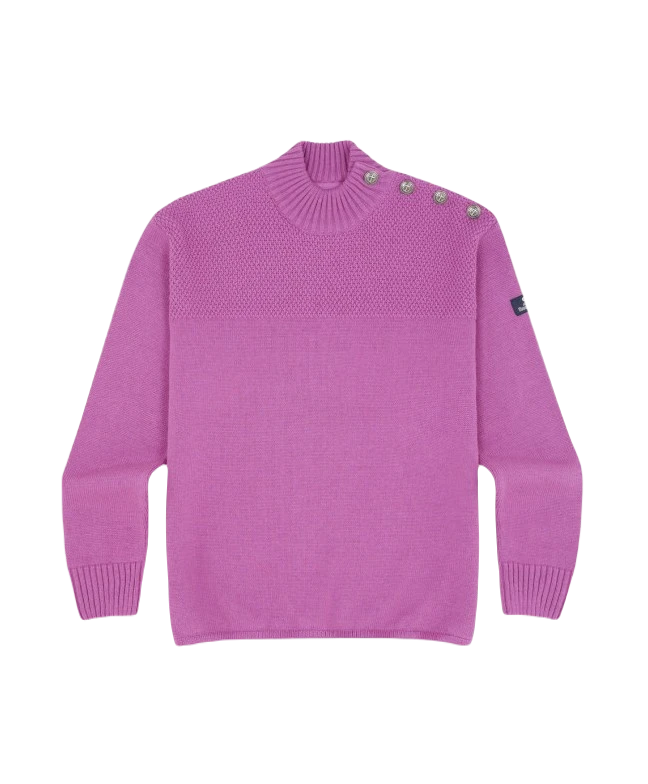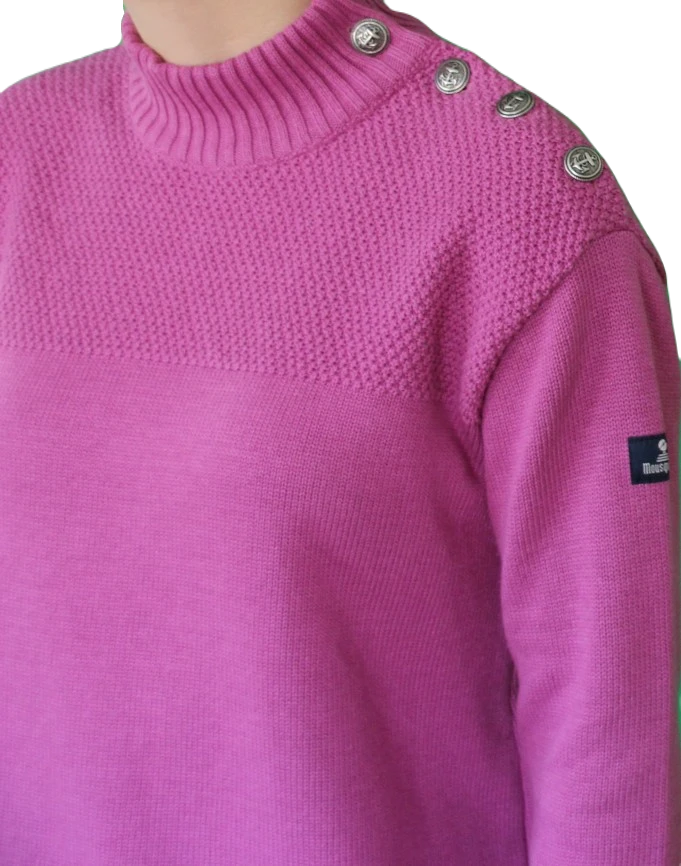 Ein tolles Basic Must-have von Mousqueton ist dieser beerenfarbene Pullover mit Seemannsknöpfen. Der Materialmix aus Biobaumwolle und Wolle trägt sich sehr angenehm auf der Haut. Eyecatcher sind die Ankerknöpfe im Schulterbereich und der obeere Teil des Pullovers, welcher im Perlmusterstrick gehalten ist. Der Feinstrickpullover wirkt sportlich lässig und feminin zugleich, damit ist er der perfekte Begleiter für viele Gelegenheiten.