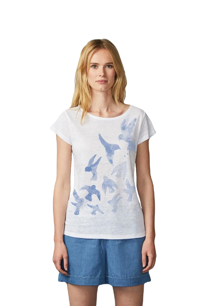 Feinstes Leinen zu einem wunderschönen Shirt verarbeitet. Der beschwingte Druck mit Vögeln erfolgte auf umweltschonender Wasserbasis. Das dünne Material sorgt für ein sommerleichtes Tragegefühl. Maße Gr.S: Breite von Achsel zu Achsel: 45 cm/ Länge ab Mitte Schulter 60cm