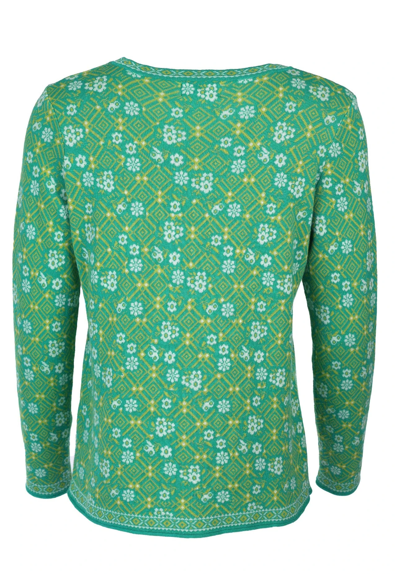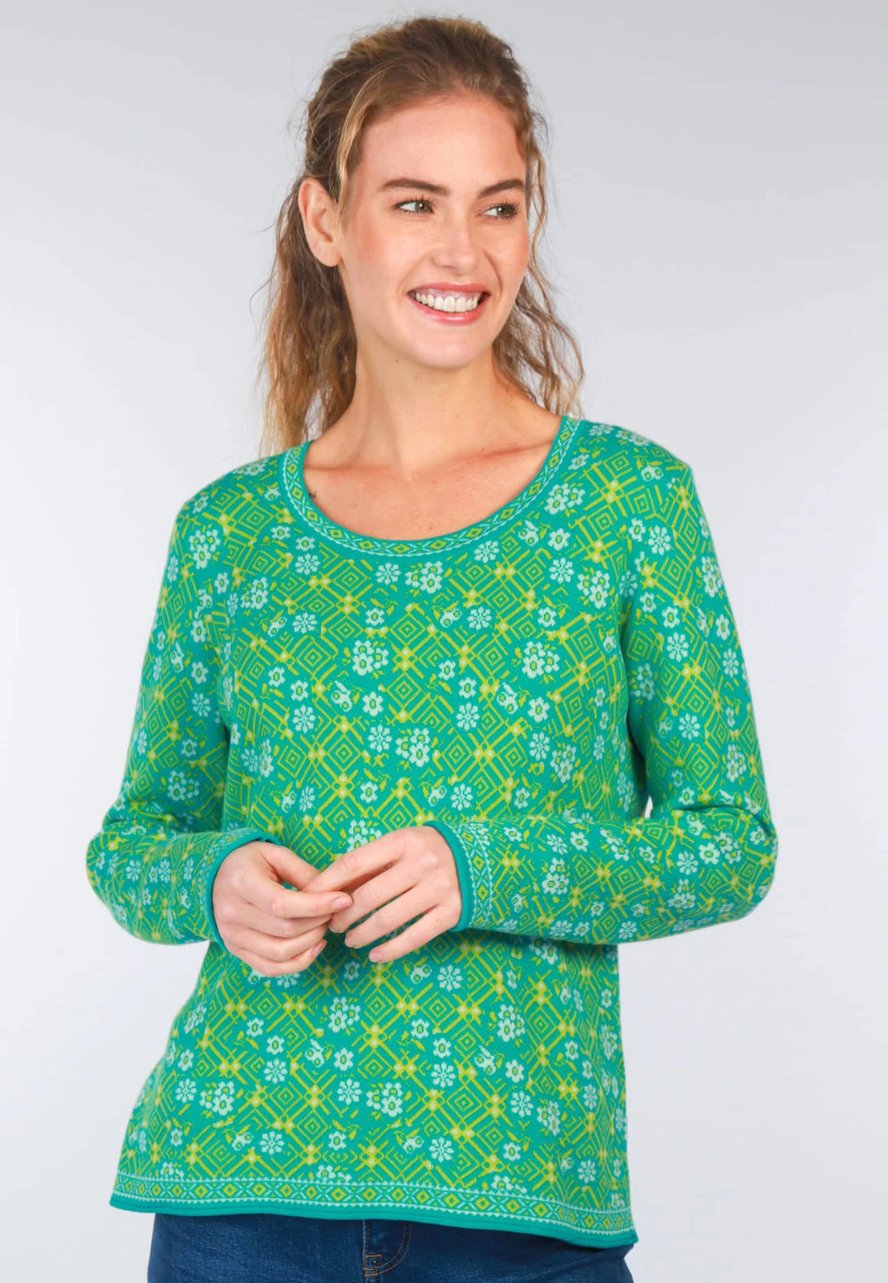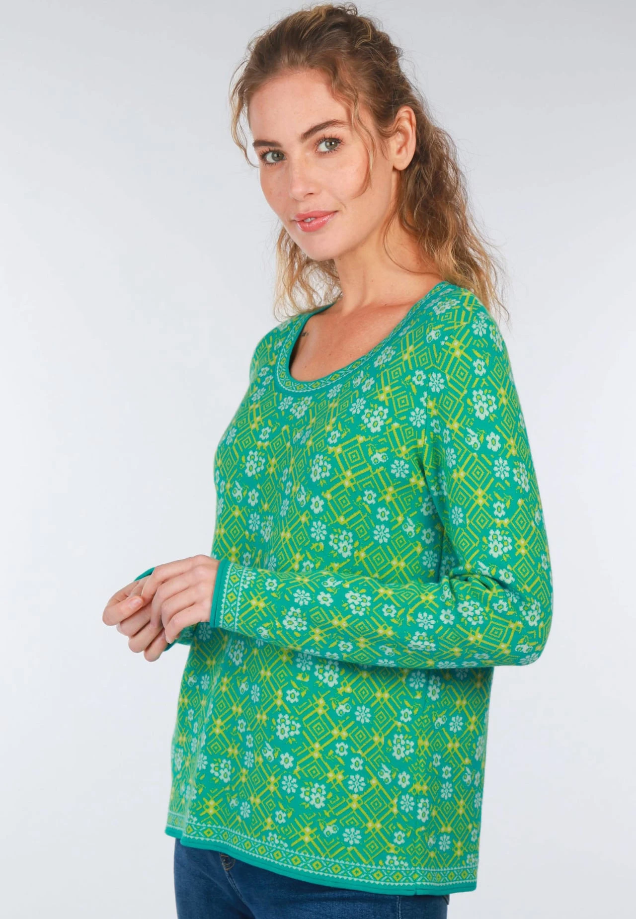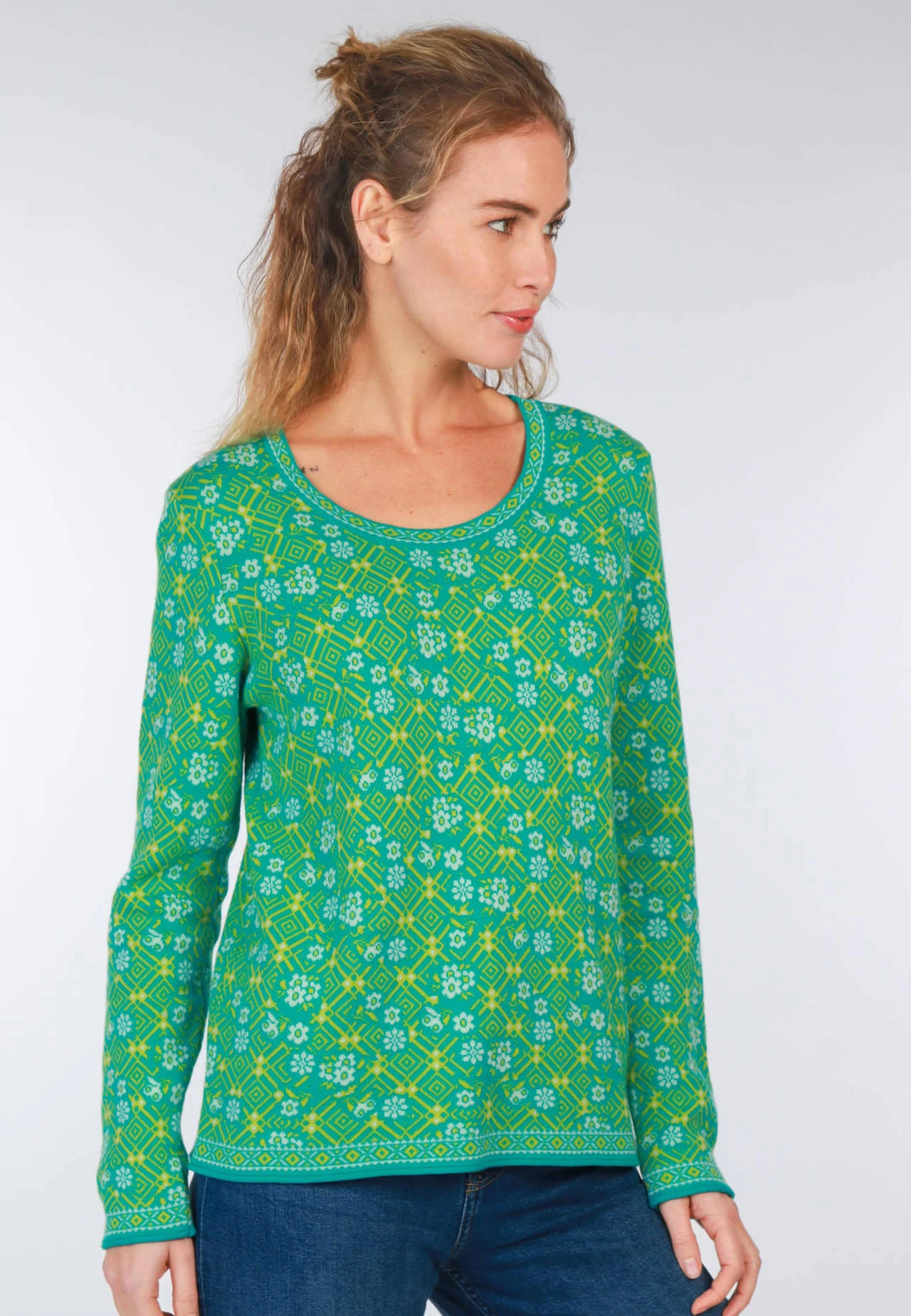 Länge 61cm (M). Unser Pullover JOSEFINE GEOFLOWER aus 100% Organic Cotton ist der perfekte Begleiter für stilbewusste Frauen mit einem Faible für Nachhaltigkeit. Das aufwändige Jacquardmuster verleiht diesem Pullover einen ganz besonderen Charme und setzt modische Akzente. Der Rundhals-Ausschnitt und die entspannte Passform sorgen dafür, dass Sie sich wohl fühlen und eine optimale Bewegungsfreiheit haben. Aus 100% Organic Cotton gefertigt ist er eine nachhaltige Alternative und trägt sich wunderbar auf der Haut.