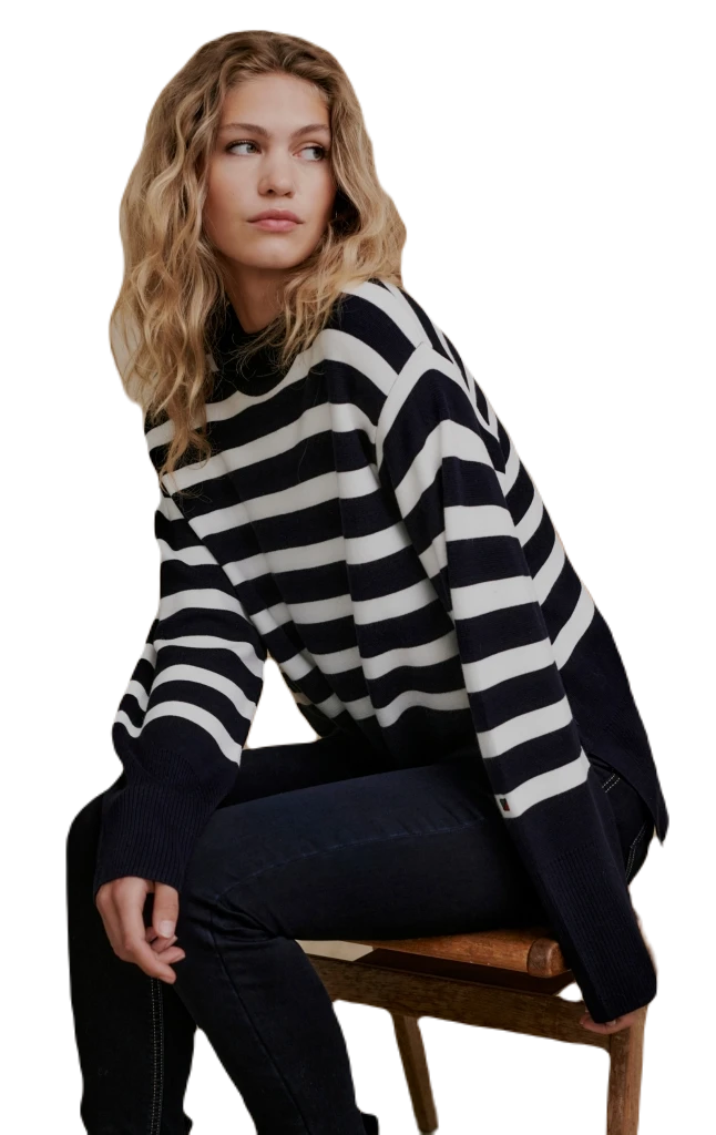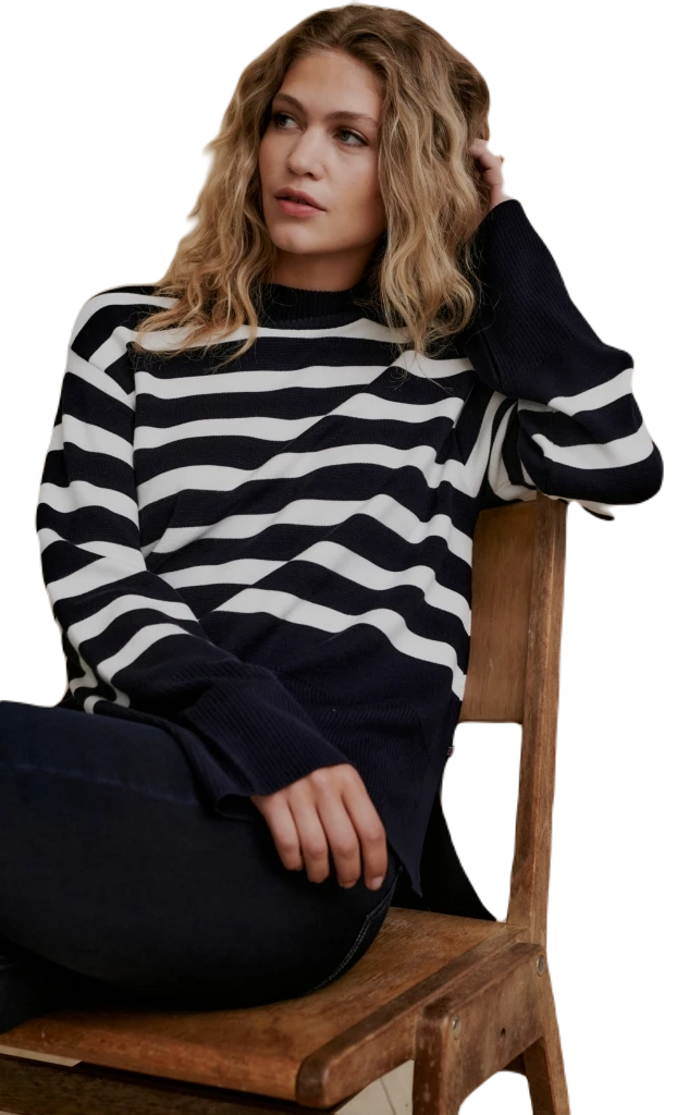 Ein locker leger geschnittener Damen Pullover in blau-weiß gestreiftem Design aus hochwertiger Viskose ist die ideale Wahl für stilbewusste Frauen, die sowohl Komfort als auch Eleganz schätzen. Dieser modische und dennoch zeitlose maritime Pullover sorgt für ein angenehmes Tragegefühl. Eigenschaften: Farbe und Muster: Dieser Pullover zeichnet sich durch sein zeitloses und ansprechendes blau-weiß gestreiftes Design aus. Die Streifen verleihen ihm einen klassischen Look, der sich leicht mit verschiedenen Outfits kombinieren lässt. Material: Der Pullover besteht aus hochwertiger Viskose, einem Material, das für seinen seidigen Griff und seine Atmungsaktivität bekannt ist. Viskose sorgt für angenehmes Tragegefühl und ermöglicht eine optimale Luftzirkulation. 96% Viskose, 4% Elasthan Passform: Der Damen Pullover relativ weit geschnitten, so dass er locker und leger sitzt. Vielseitigkeit: Dieser Pullover ist vielseitig einsetzbar und eignet sich sowohl für formelle Anlässe als auch für den Freizeitlook. Kombinieren Sie ihn mit Jeans für einen entspannten Alltagsstil oder tragen Sie ihn mit einer eleganten Hose für einen schickeren Look. Pflegeleicht: Die Pflege dieses Pullovers ist unkompliziert. Er kann in der Maschine gewaschen werden, was Ihnen Zeit und Aufwand spart. Stil, Qualität und Komfort vereinen sich in diesem Damen Pullover, um sicherzustellen, dass Sie sich in Ihrer Kleidung wohlfühlen und gleichzeitig stilvoll auftreten. Bestellen Sie noch heute und bereichern Sie Ihre Garderobe um dieses zeitlose und modische Kleidungsstück.