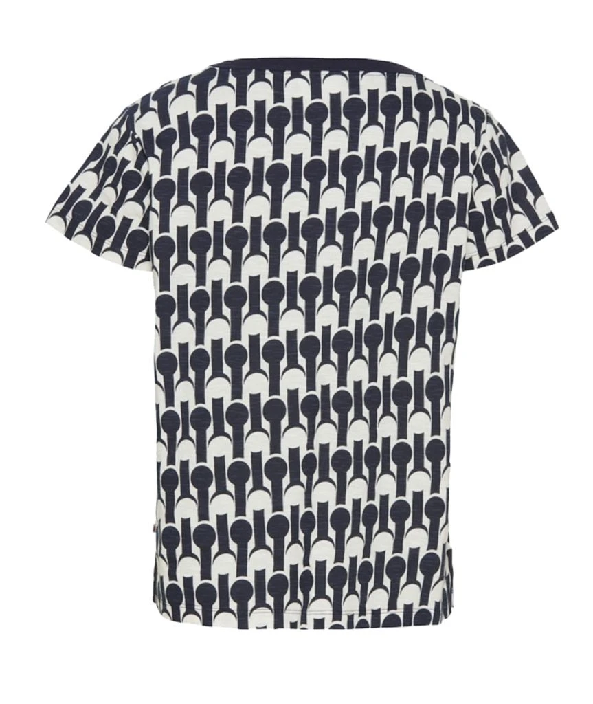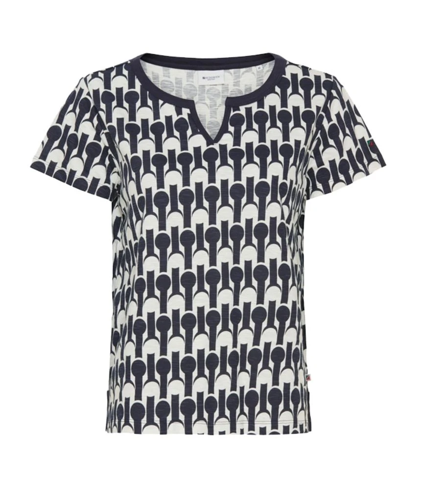 Ein stylischer Hingucker für den Alltag – das Shirt von Red Green mit seinem schönen Ornamentmuster in Dunkelblau auf Weißem Grund. Ein wunderbares Basic, welches sich hervorragend kombinieren lässt.