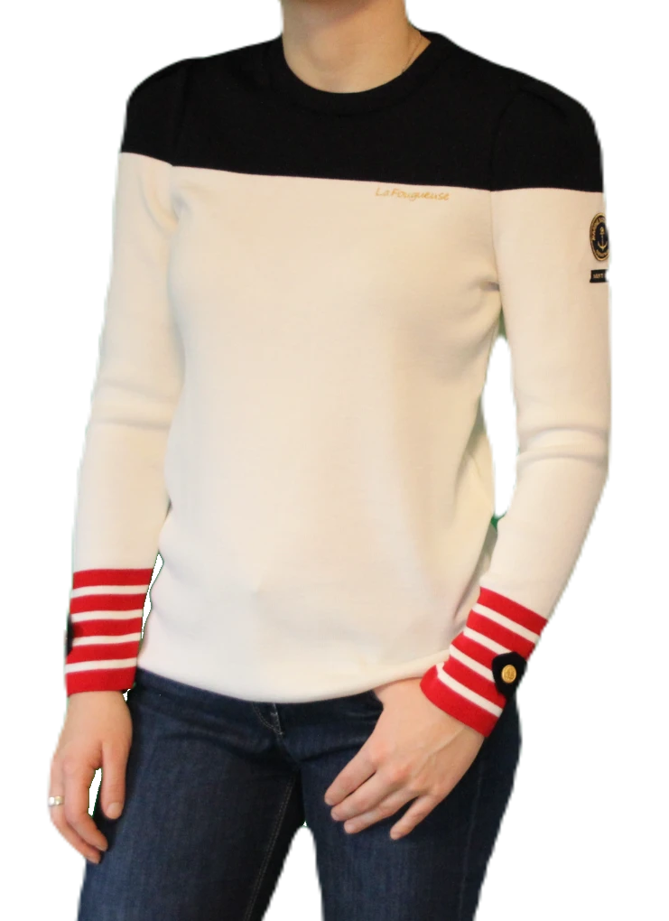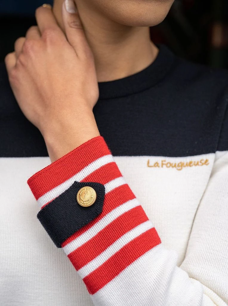 Mirabeau ist ein Wollpullover im klassischen1x1 Rippstrick den Saint James in Zusammenarbeit mit Marine Nationale erschaffen hat. Vom maritimen Erbe inspiriert, wurde er im Matrosenstil in den Farben Ecru Navy und Rot gefertigt. Die Puffärmel geben dem sportiven Pullover einen femininen Touch, die gestreiften Armbündchen mit Riegel und Ankerknopf untestreichen den maritimen Charakter. Die Kollektion von Saint James begeistert seit 1889 nicht nur Seefahrer und Sportsegler. Zahlreiche Kunden aus aller Welt sind von den Produkten angetan, sie schätzen die Qualität und Langlebigkeit und halten der Marke seit vielen Jahren die Treue. Fotos: N&M Handel Kleinsteiber