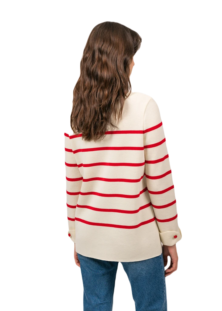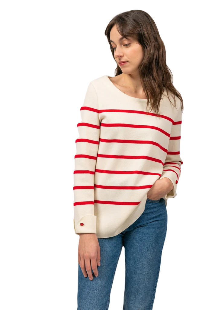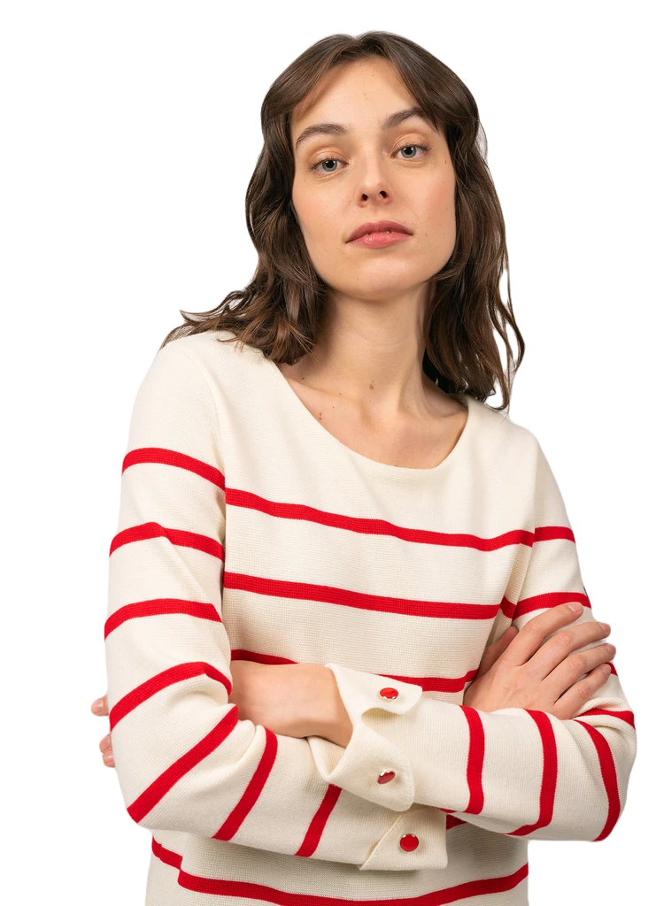 Chambéry ist ein Wollpullover im Tunika-Stil. Von dem maritimen Erbe inspiriert, wurde er im Matrosenstil mit Streifen und einem leichten U-Boot-Ausschnitt gefertigt. Die Umschlagbündchen der Ärmel werden von Knöpfen, in der Farbe der Streifen, verziert und geben den Pullover das gewisse Etwas. Die Kollektion von Saint James begeistert seit 1889 nicht nur Seefahrer und Sportsegler. Zahlreiche Kunden aus aller Welt sind von den Produkten angetan, sie schätzen die Qualität und Langlebigkeit und halten der Marke seit vielen Jahren die Treue. Fotos: Tricots Saint-James France/ gezeigte Accessoires sind nicht Bestandteil des Angebotes