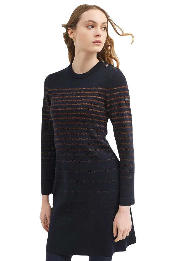 Ein wunderschönes exklusives Designerkleid aus dem Hause Saint James, gefertigt aus reiner weicher Schurwolle überzeugt mit Lurex durchzogenen Streifen, diese verleihen dem Kleid seinen luxuriösen Touch den es mehr als verdient. Schon beim hineinschlüpfen werden Sie spüren, dass dies etwas ganz Besonderes ist …. lassen Sie sich überzeugen! Die mit Lurex durchzogenen bronzefarbenen Streifen lassen Sie in einer wunderschön, figurbetonten Silhouette erstrahlen. Die Größen, welche zur Auswahl stehen, sind Ihrem Land angepasst (Shop Sprache: Deutsch = deutsche Größen/ Shop Sprache französisch = französische Größen)