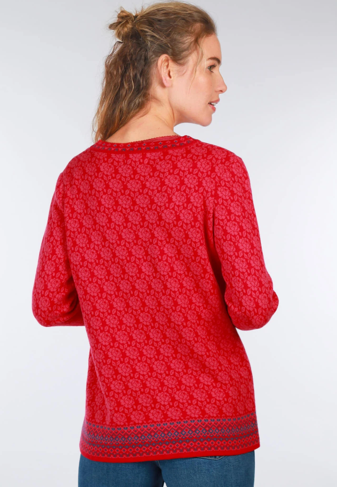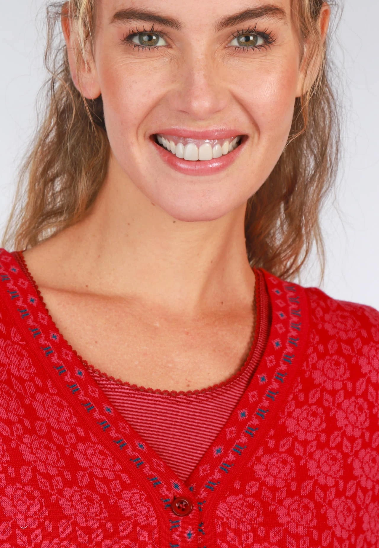 Länge 65cm (M). Unser V-Neck-Cardigan ist ein absolutes Must-Have für jede modebewusste Frau, die auf Nachhaltigkeit setzt. Das farbenfrohe florale Jacquardmuster ist ein Blickfang und sorgt für einen femininen Look. Hergestellt aus 100% Organic Cotton ist sie nicht nur angenehm zu tragen, sondern auch umweltfreundlich produziert. Die lockere Passform und der modische V-Ausschnitt machen diese Strickjacke zum vielseitigen Begleiter für jeden Anlass.