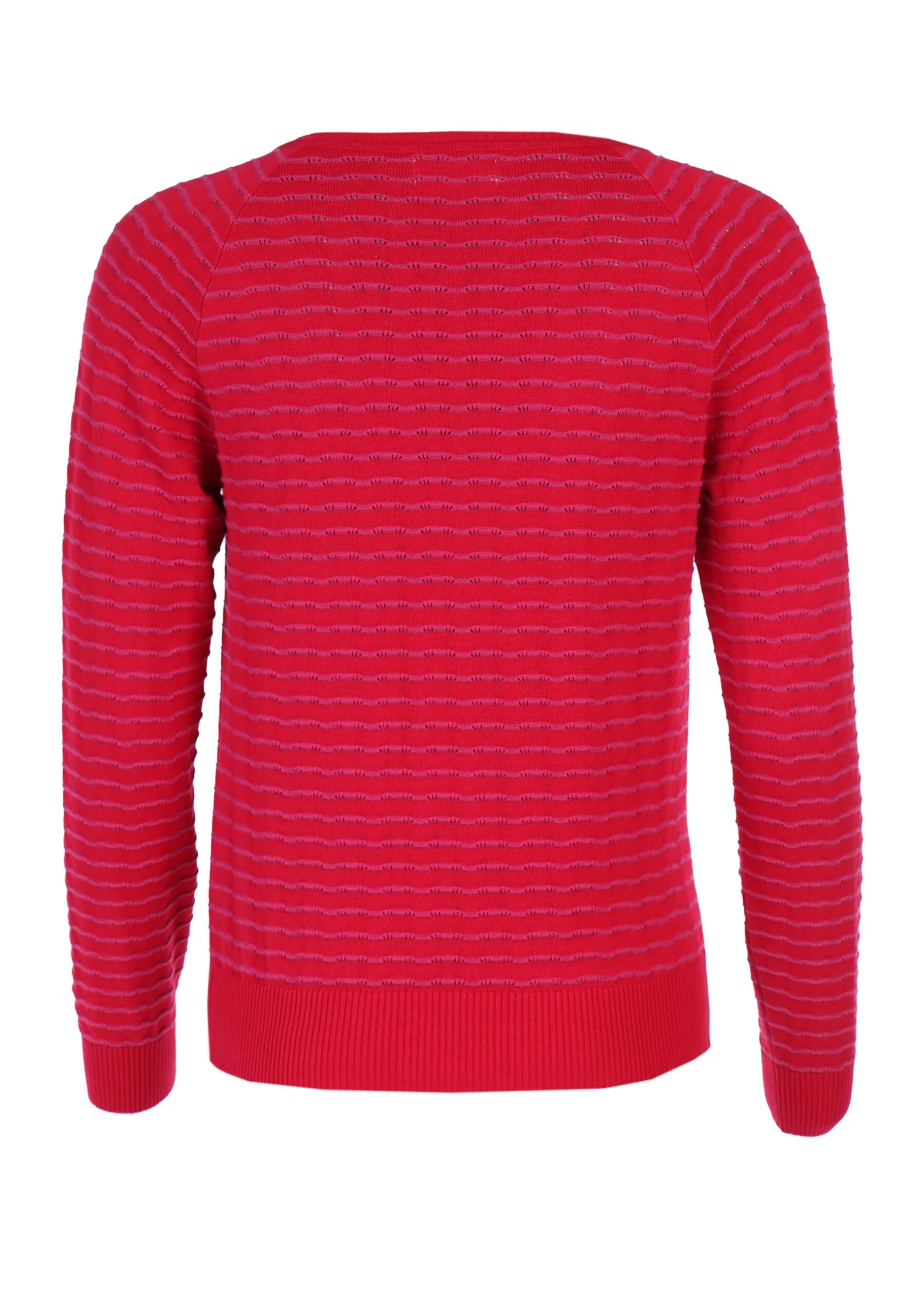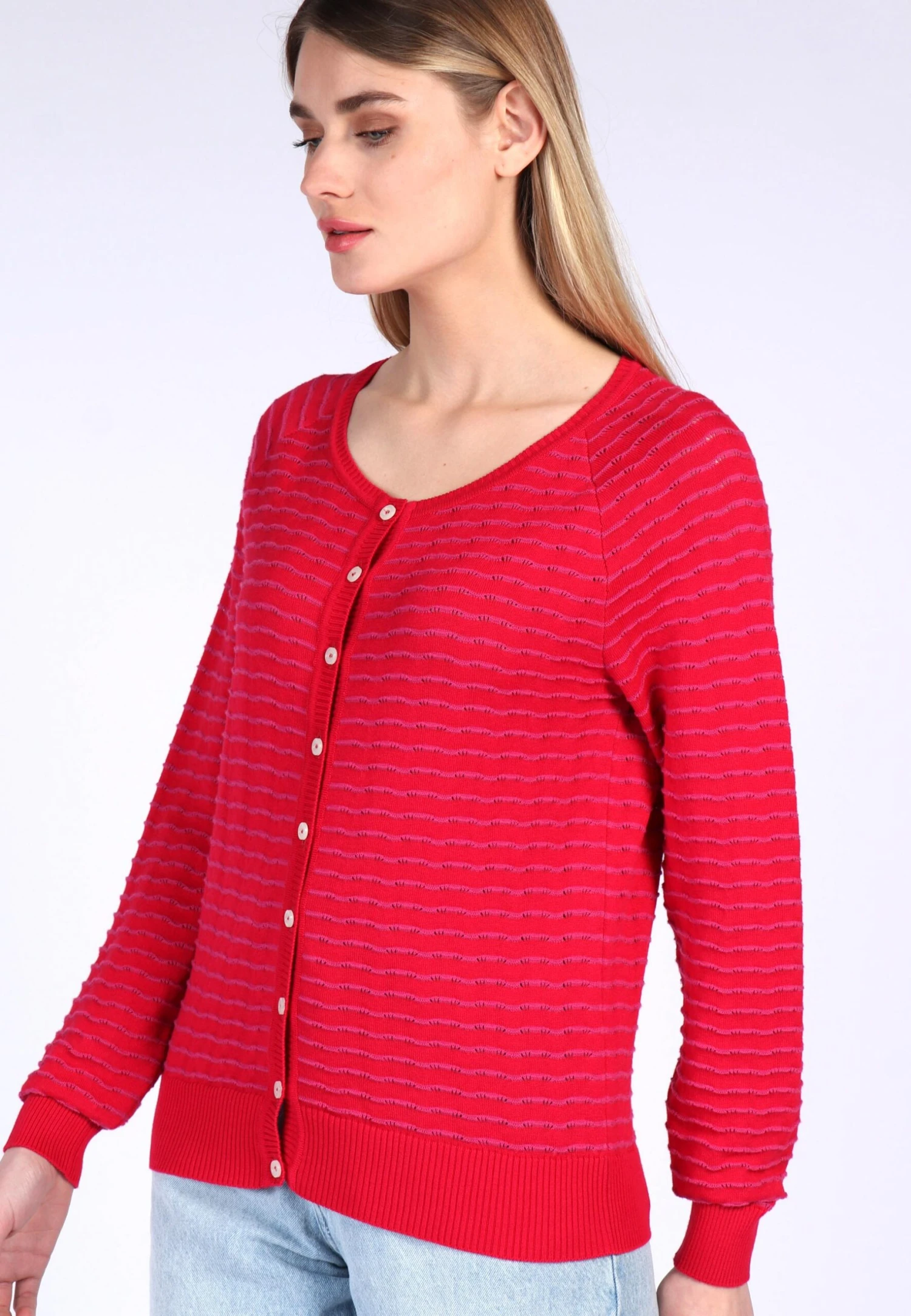 Gesamtlänge 58 cm bei Größe M. Diese Rundhals-Strickjacke mit breiten Ripp-Bündchen an Ärmel und Saum, ist mit seinem 2-farbigen, gestreiften Lochmuster ein echter Farbtupfer. Der Style Patie kann super zu unseren Kleidern und Röcken kombiniert werden. Aber auch einfach nur zur Jeans getragen, rundet dieser Cardigan den sportlich-lässigen Look ab. Durch die verwendete Bio-Baumwolle ist sie sehr angenehm zu tragen.