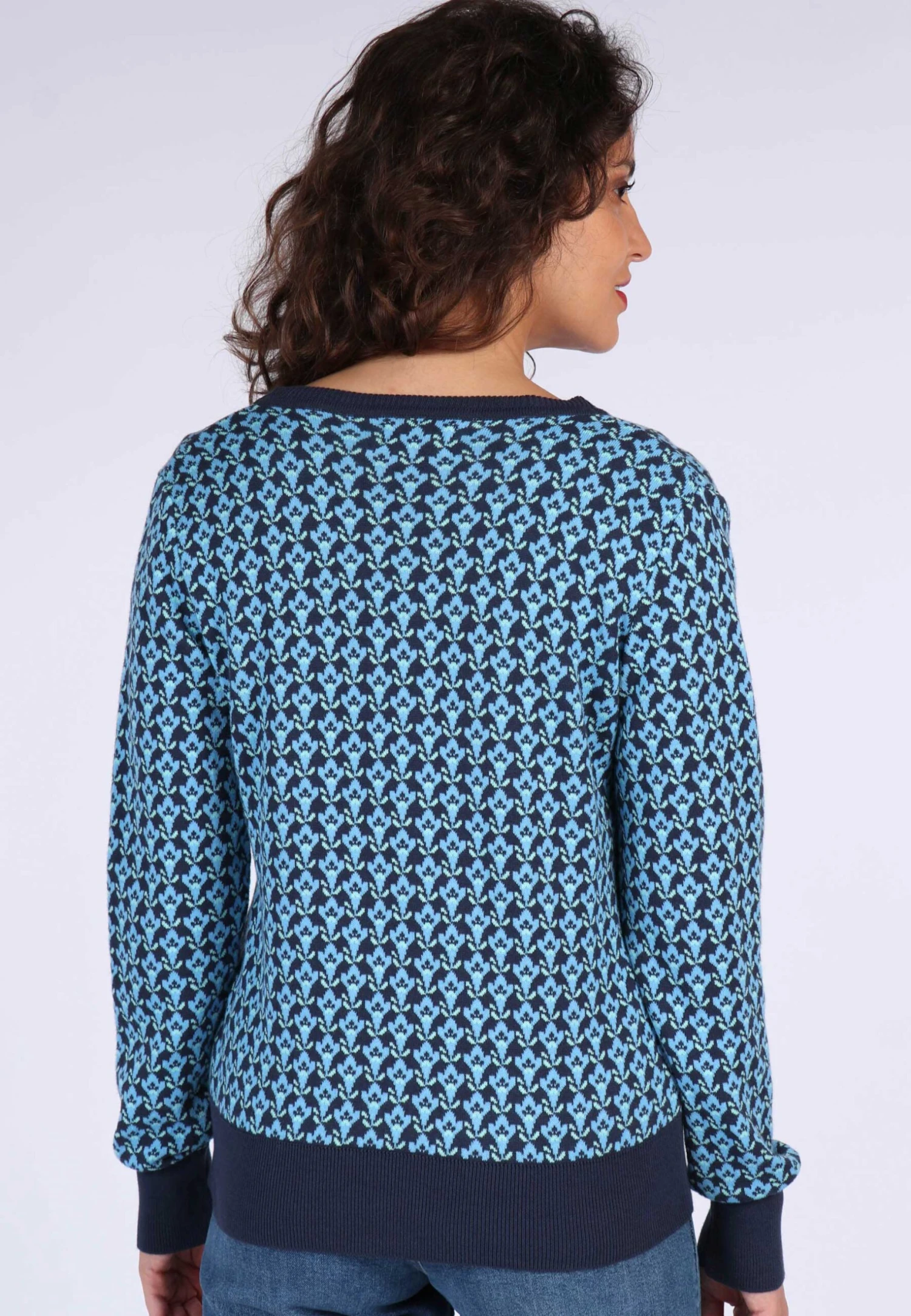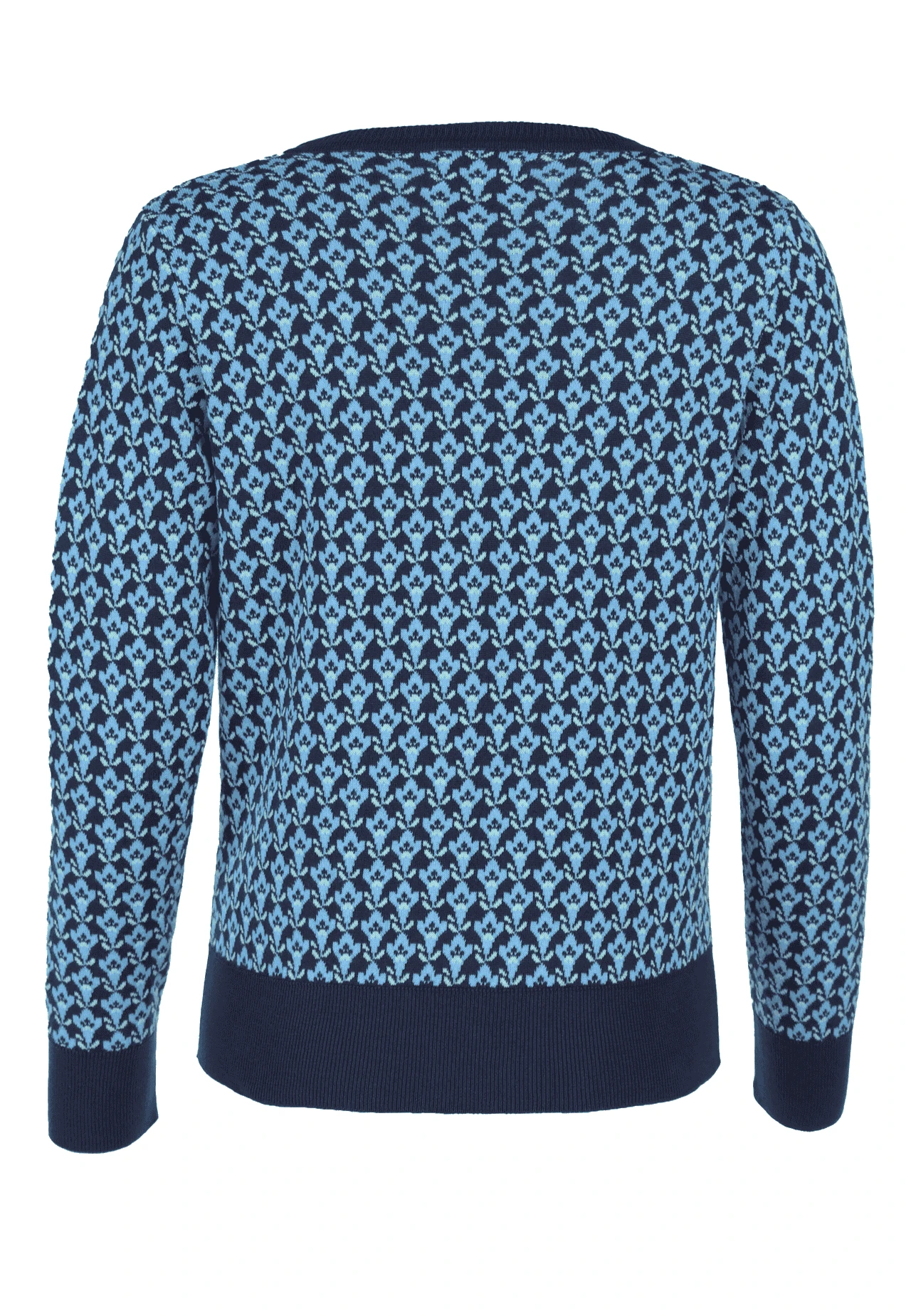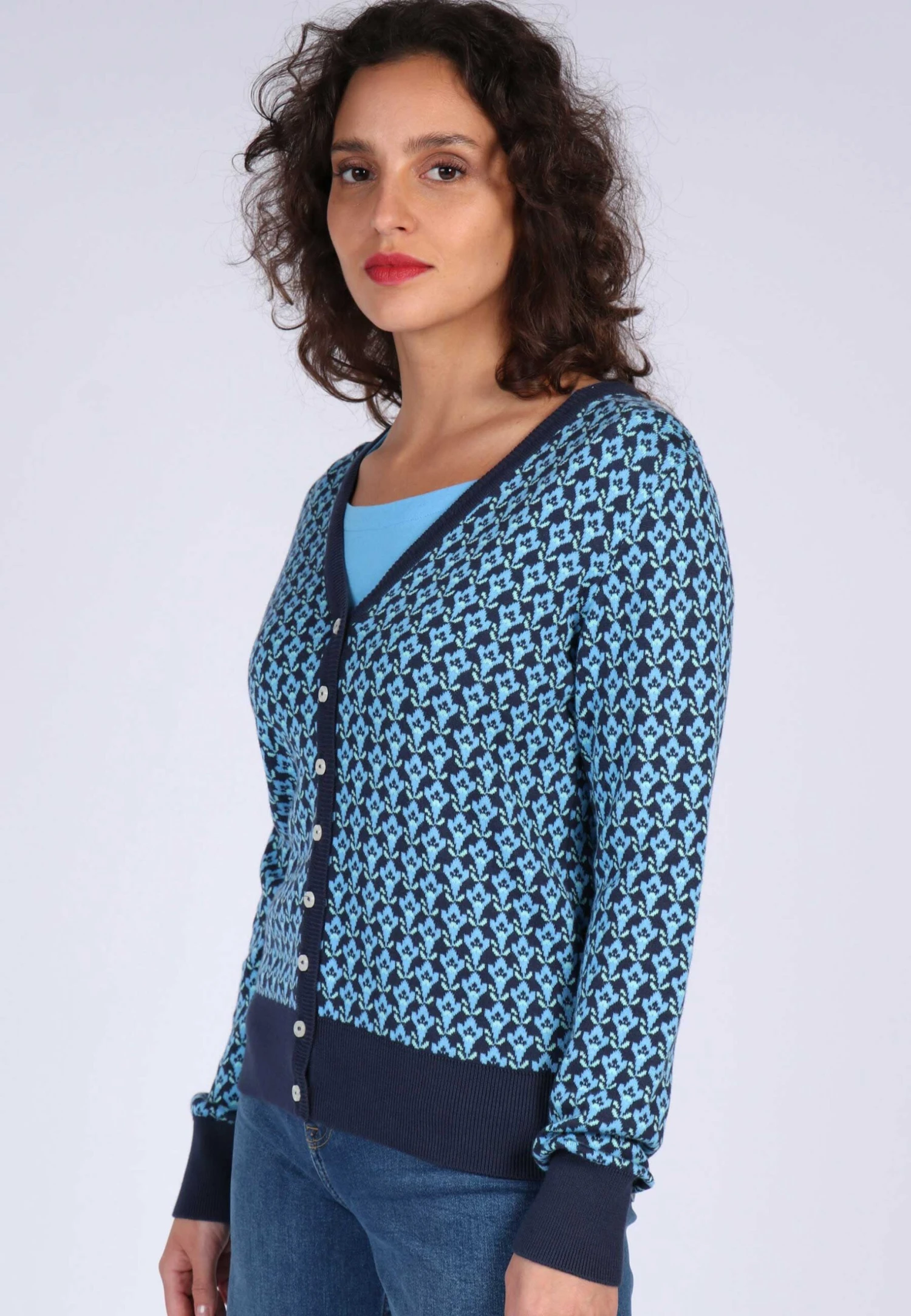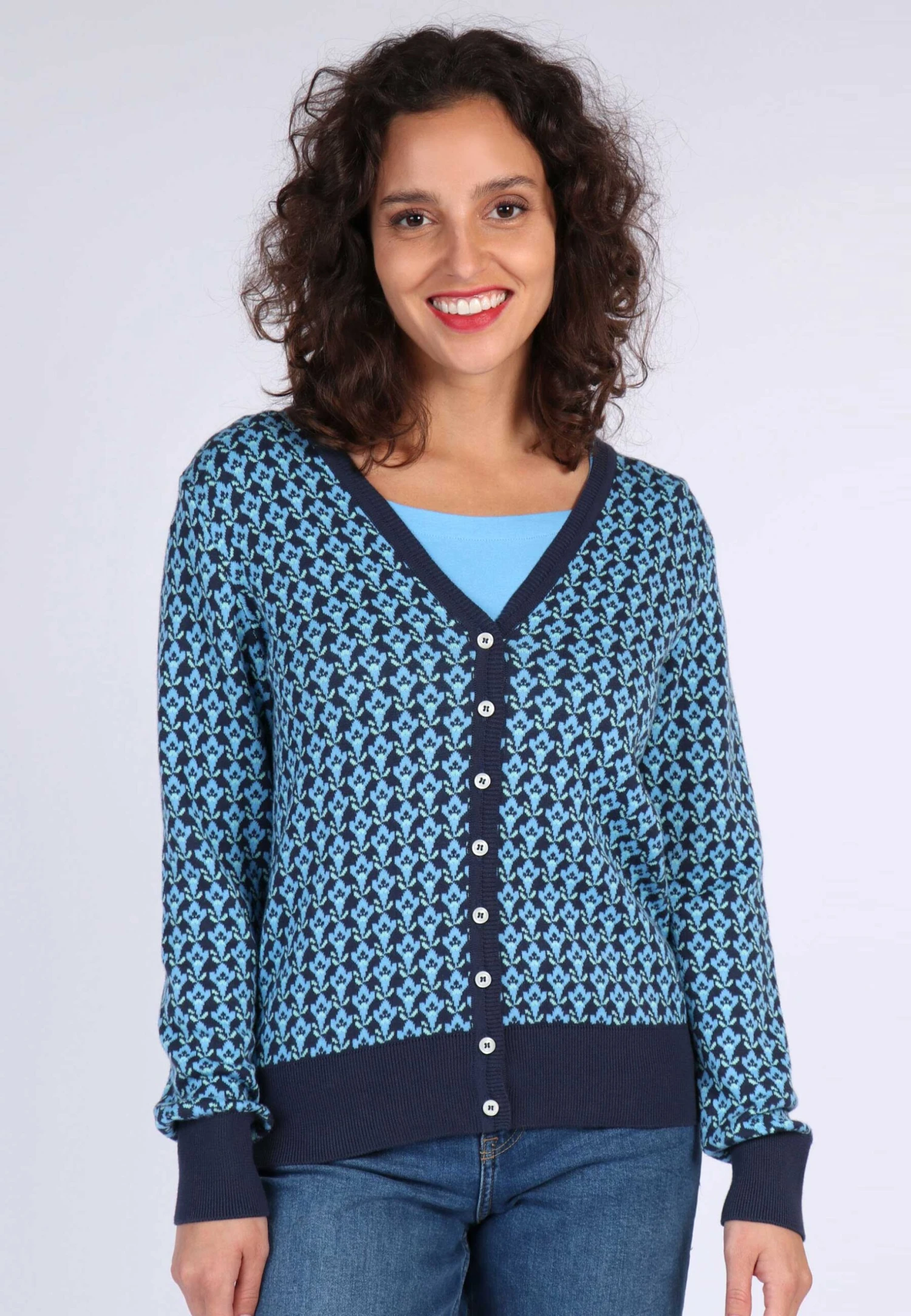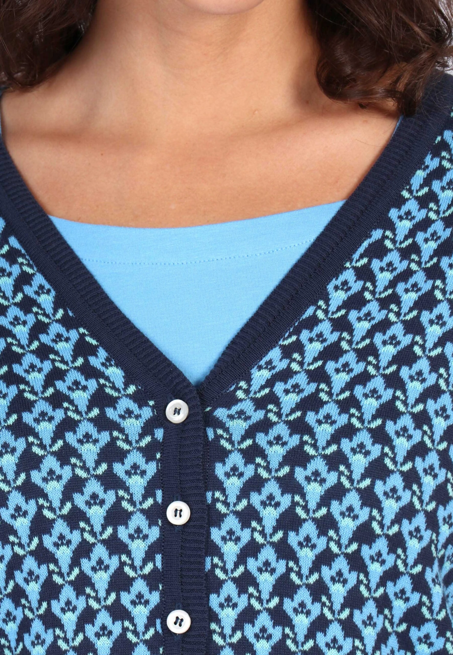 Gesamtlänge 58 cm bei Größe M. Diese Strickjacke mit V-Ausschnitt, langen Ärmeln und dem bunten floralen Jacquardmuster im Retrostil ist ein besonderes Highlight. Sie unterstreicht in Kombination zu Jeans und unseren Röcken den femininen Look. Durch die verwendete Bio-Baumwolle ist sie sehr angenehm zu tragen.