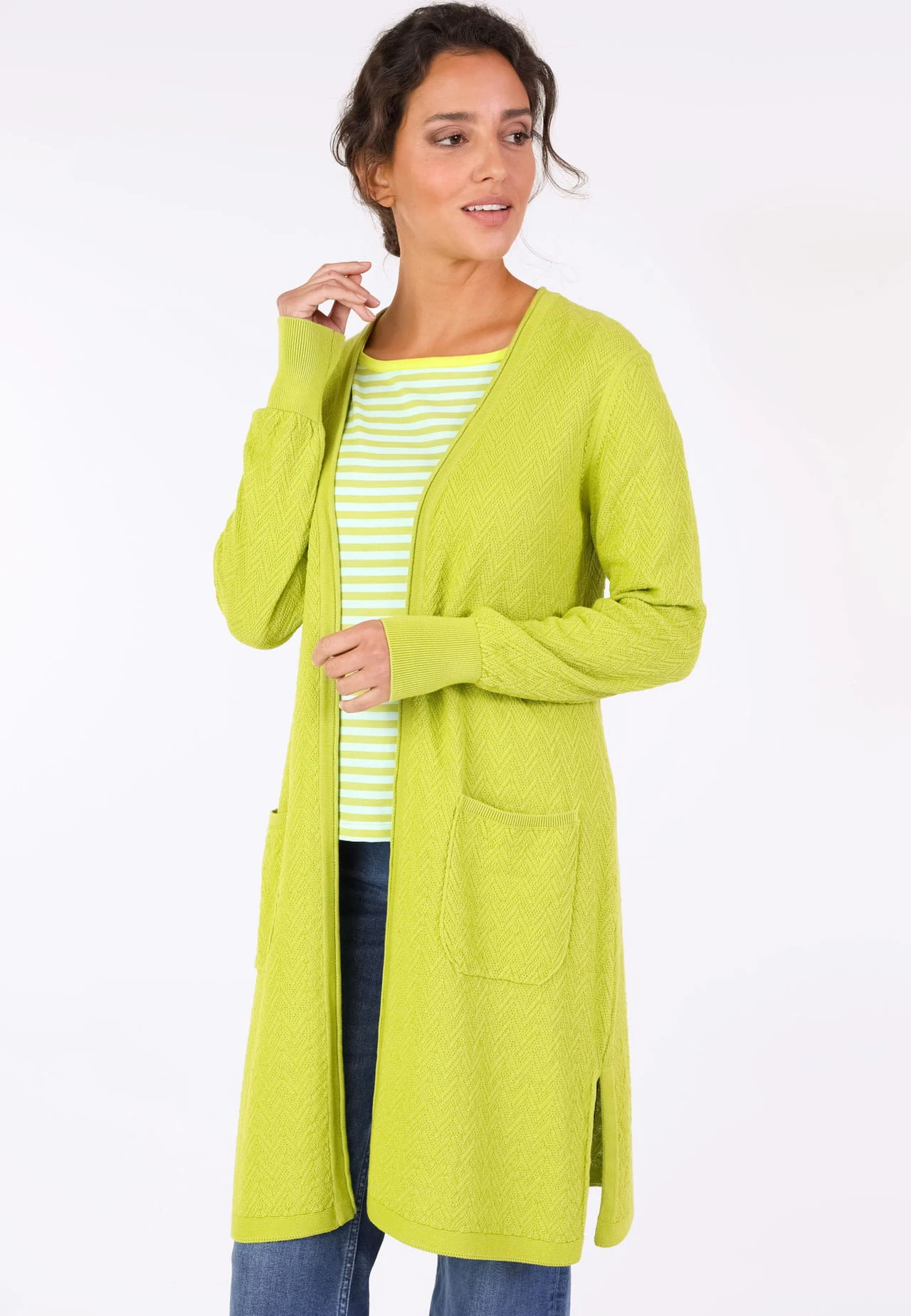 Dieser Strickmantel ist eine gemütliche aber stylische Hülle. Die breiten Rippen-Bündchen sowie die aufgesetzten Taschen sind weitere praktische Details. Der Style Emma ist die perfekte Ergänzung zur Jeans, Kleidern und Röcken. Er ist ein echter Blickfang und unterstreicht den lässig-femininen Look. Durch die verwendete Bio-Baumwolle ist dieser Strickmantel sehr angenehm zu tragen.