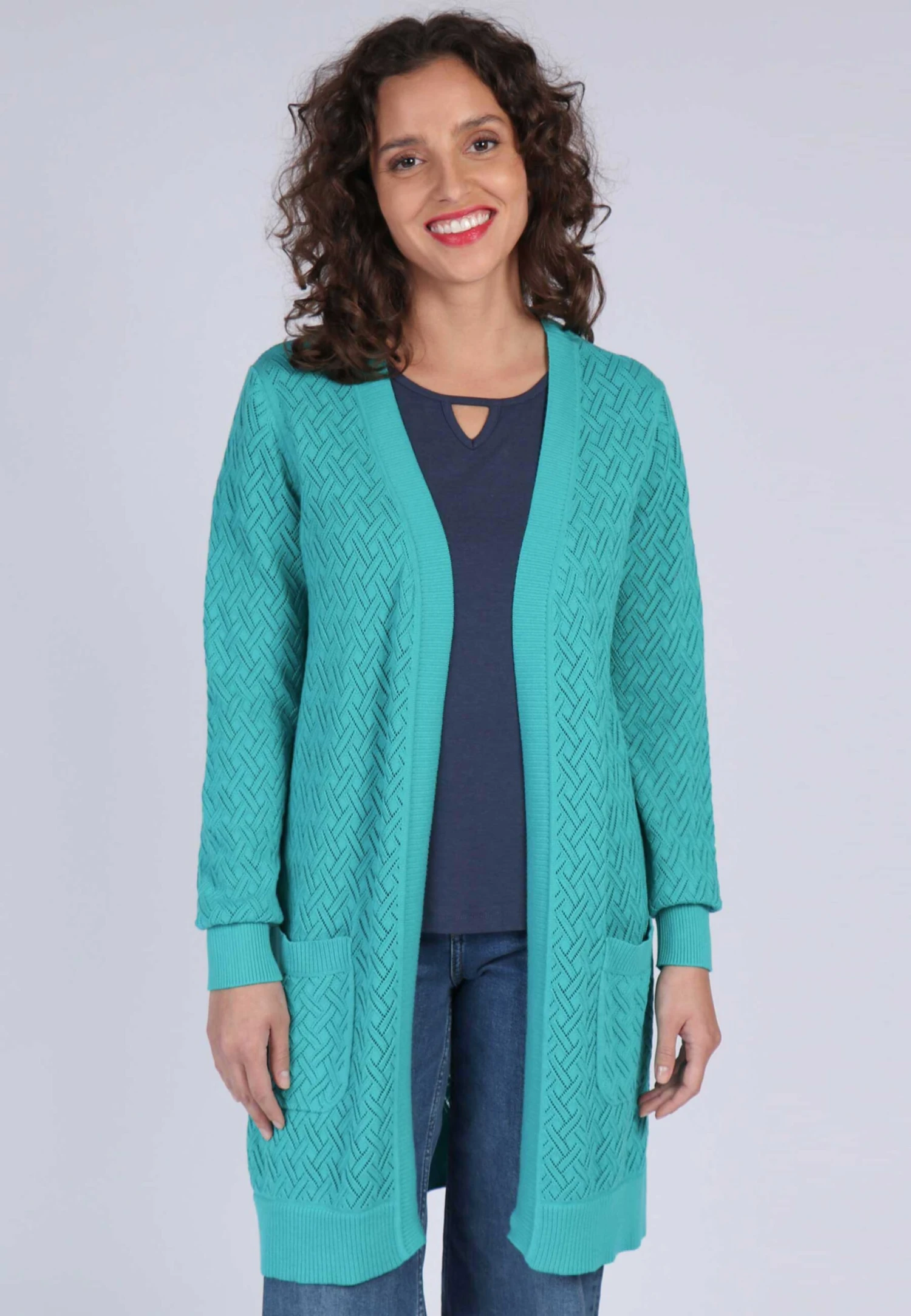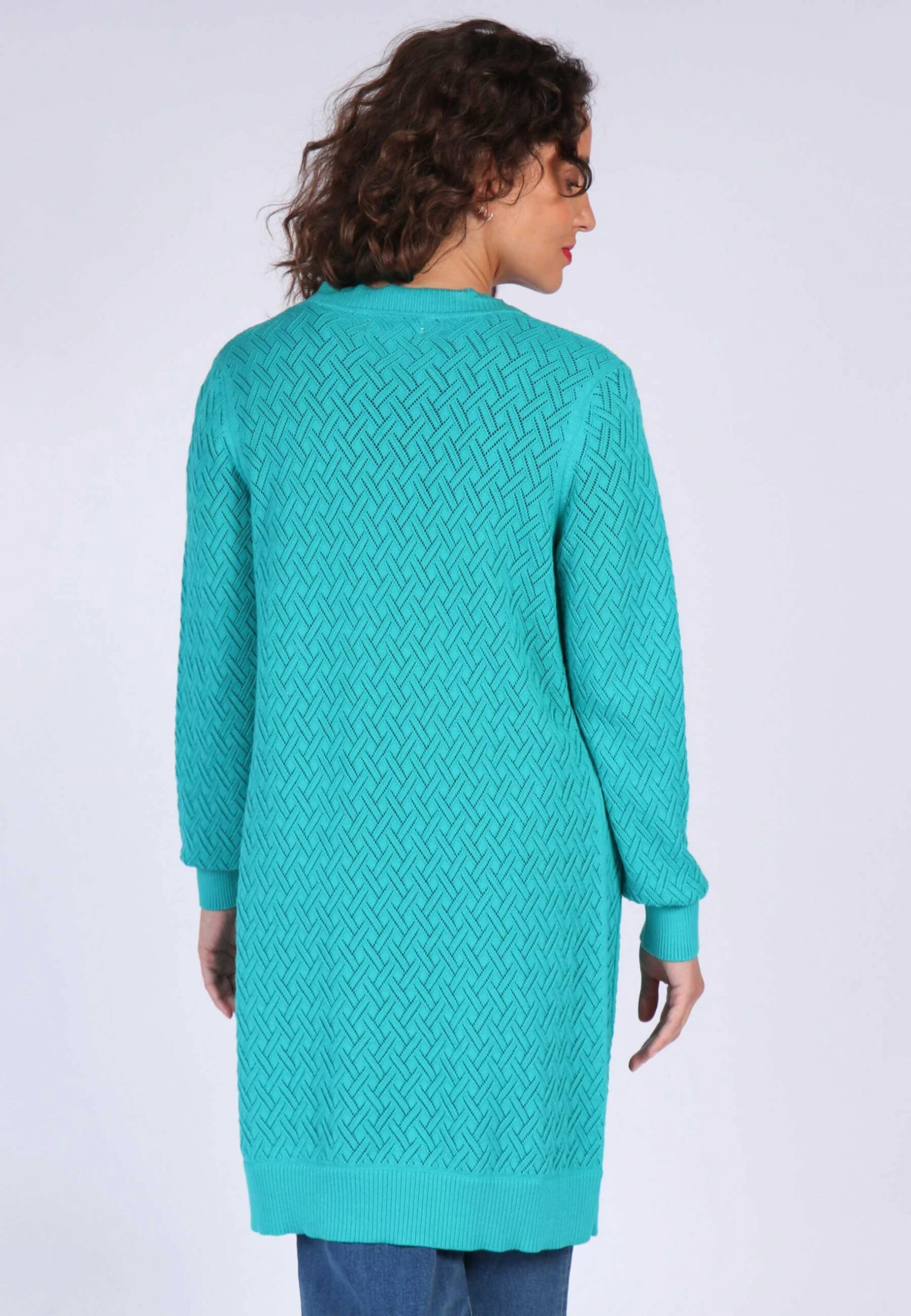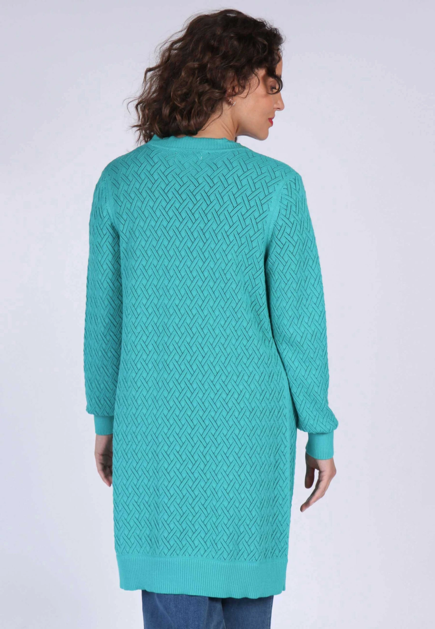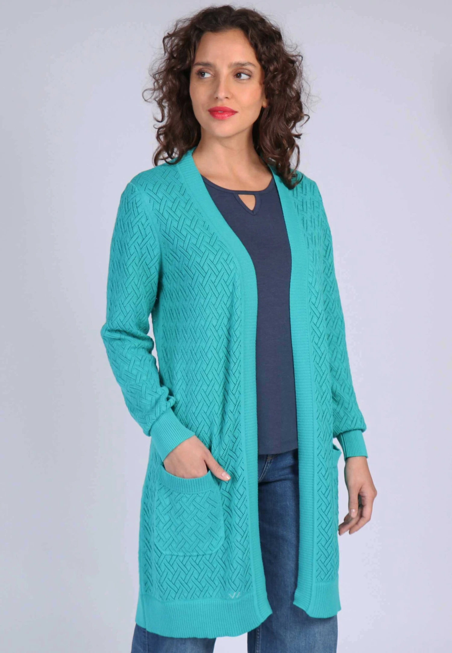 Gesamtlänge 84 cm bei Größe M. Dieser Strickmantel mit Retro-Muster ist eine gemütliche aber stylische Hülle. Die breiten Rippen-Bündchen sowie die aufgesetzten Taschen sind weitere praktische Details. Der Style Viola ist die perfekte Ergänzung zu Jeans, Kleidern und Röcken. Er ist ein echter Blickfang und untersteicht den lässig-femininen Look. Durch die verwendete Bio-Baumwolle ist dieser Strickmantel sehr angenehm zu tragen.